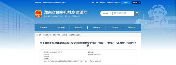 根据《湖南省建筑施工安全质量标准化考评实施细则(试行)》(湘建建〔2023〕122号)相关规定,湖南省住房和城乡建设厅对全省建筑施工企业进行了全面、严格的综合考评,并最终确定了“优良”、“合格”、“不合格”企业名单。此次考评结果已于2025年10月17日至10月24日进行公示,我公司荣列 “优良” 榜单。