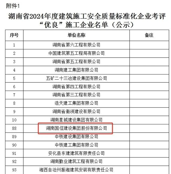 近日,从湖南省住房和城乡建设厅传来捷报,在刚刚公示的湖南省2024年度建筑施工安全质量标准化企业考评结果中,我公司凭借在安全生产和质量管理方面的优秀表现,成功获评最高等级的 “优良企业” 荣誉称号!